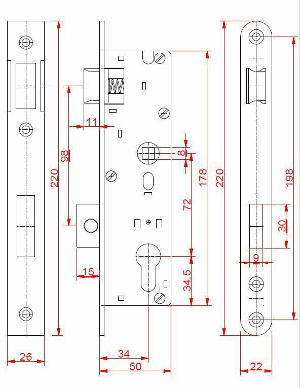 Kaseta jest uniwersalna, nadaje się do drzwi prawych i lewych. Umożliwia to dwuczęściowa budowa kasety (korpus z profilu zamkniętego i kątownik będący przylgą oporową) i obustronne wycięcie pod elektrozaczep.