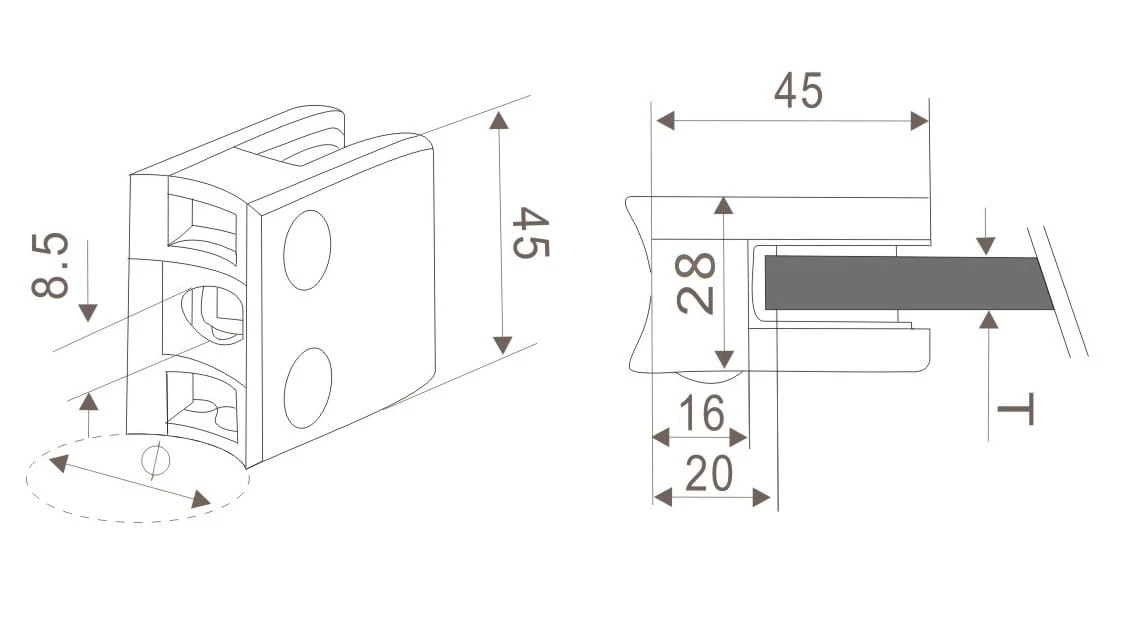Uchwyt szkła 45x45 dla rury fi 33,7